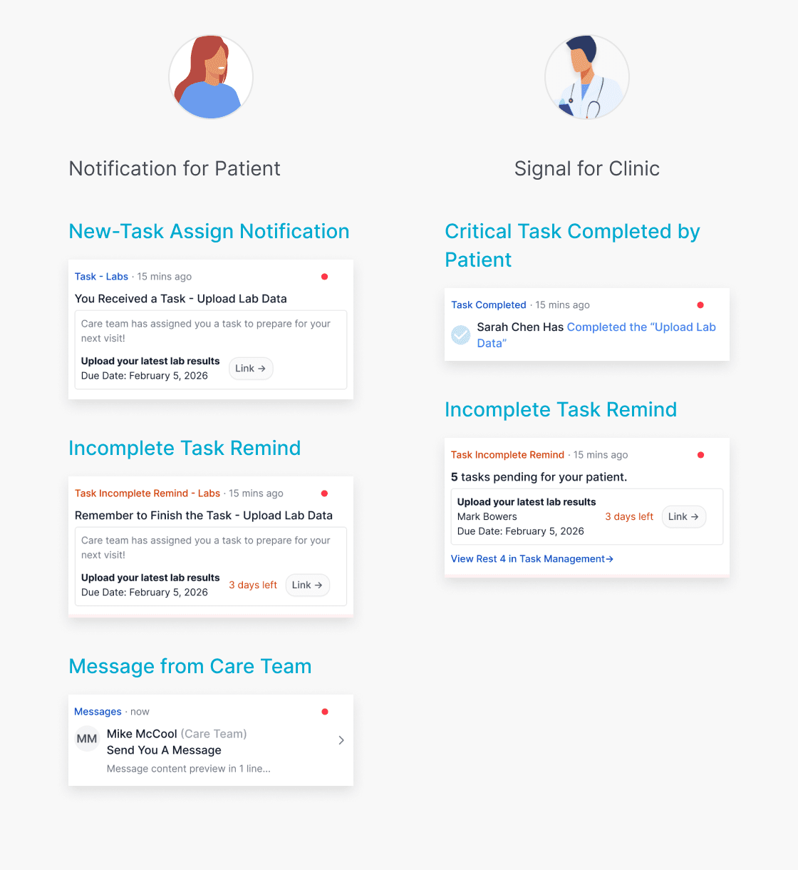 By mapping patient journeys and key handoff points, I designed a task assignment and notification system that clarified ownership and timing, achieving an 80% task completion rate and enabling more reliable, high-quality care.