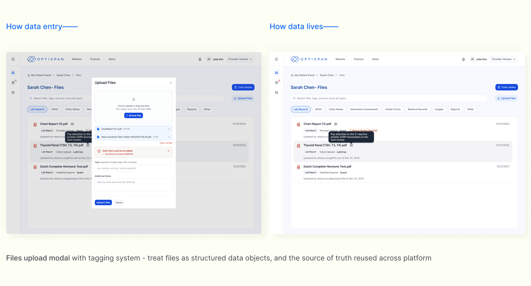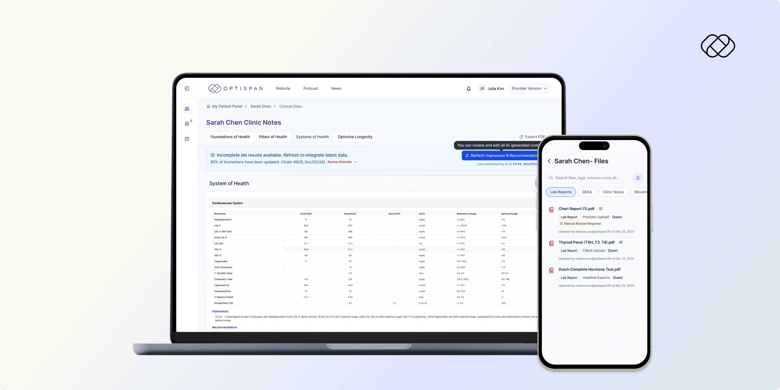 I structured data from uploaded files powered an 80+ biomarker dashboard and served as a shared foundation for both clinic decision making and AI-assisted documentation.